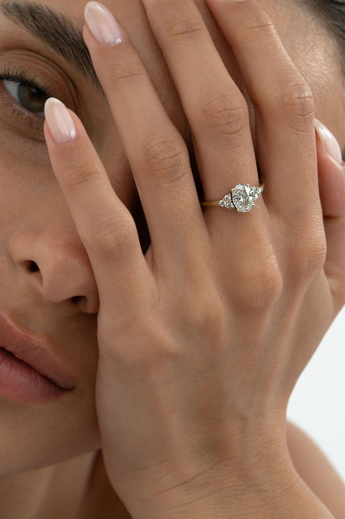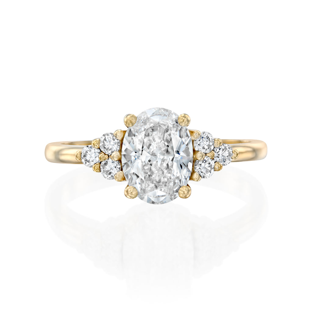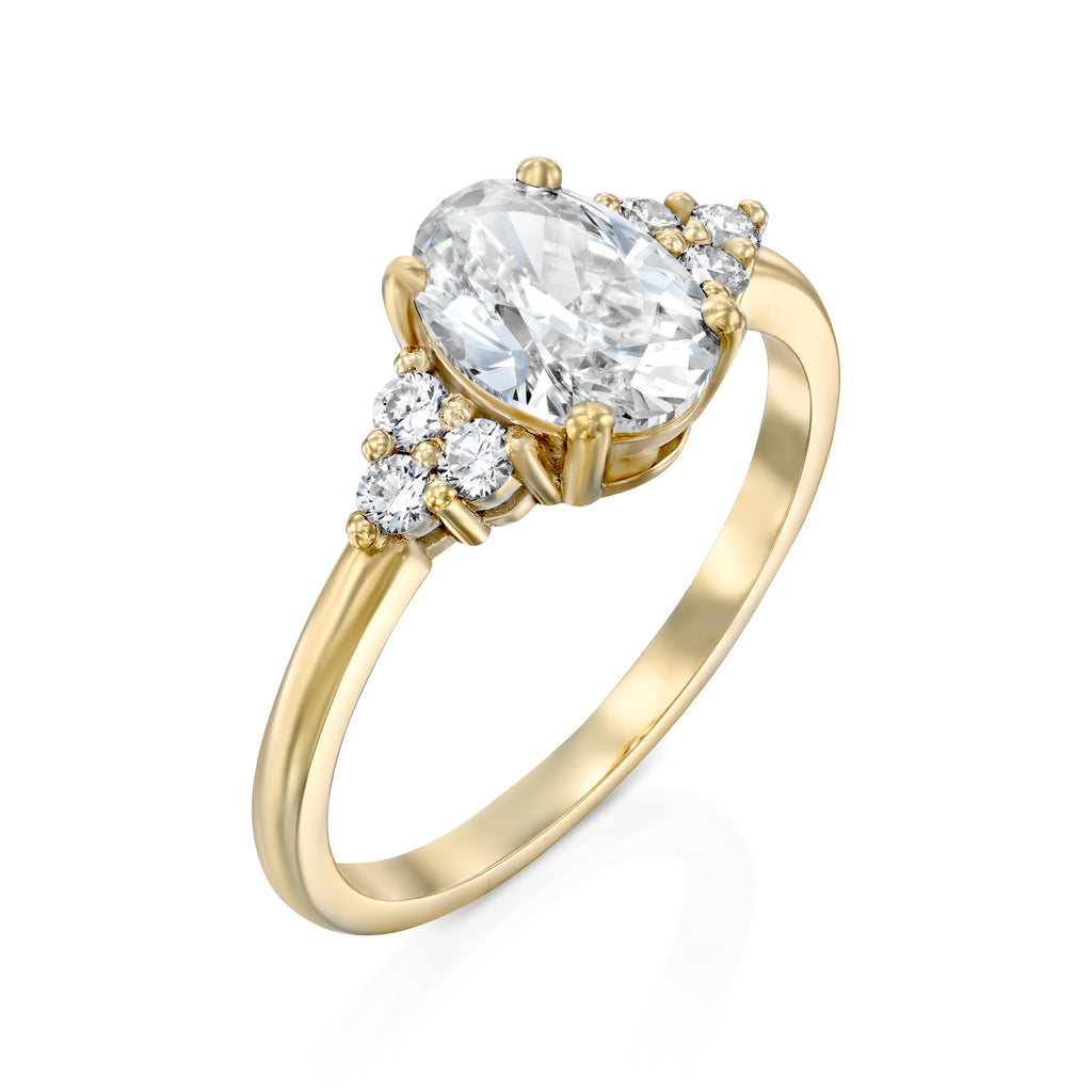 טבעת זהב 18 קראט משובצת יהלום אובל מרכזי ושישה יהלומים עגולים