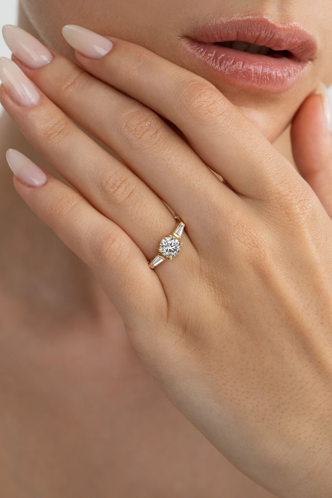 טבעת זהב 18 קראט משובצת יהלום מרכזי עגול ושני יהלומי טייפר