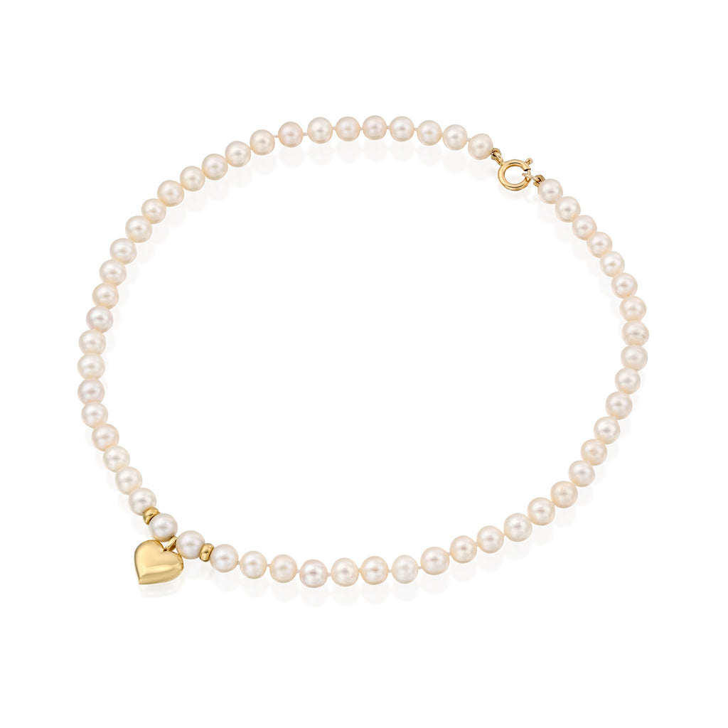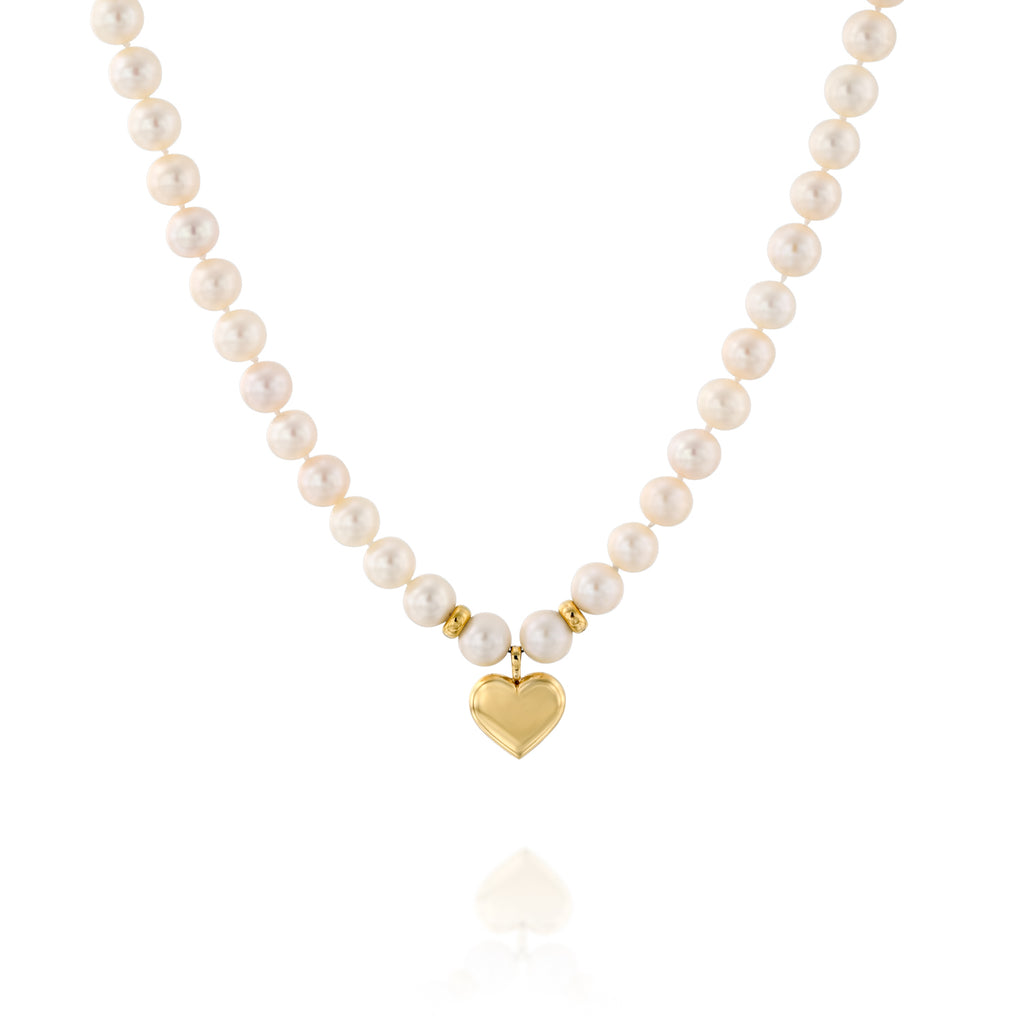 שרשרת פנינים קלאסית בשילוב חרוזי זהב ותליון לב מזהב צהוב 18 קראט