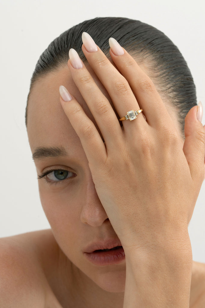 טבעת זהב 18 קראט משובצת יהלום אמרלד מרכזי ויהלומי באגט צידיים