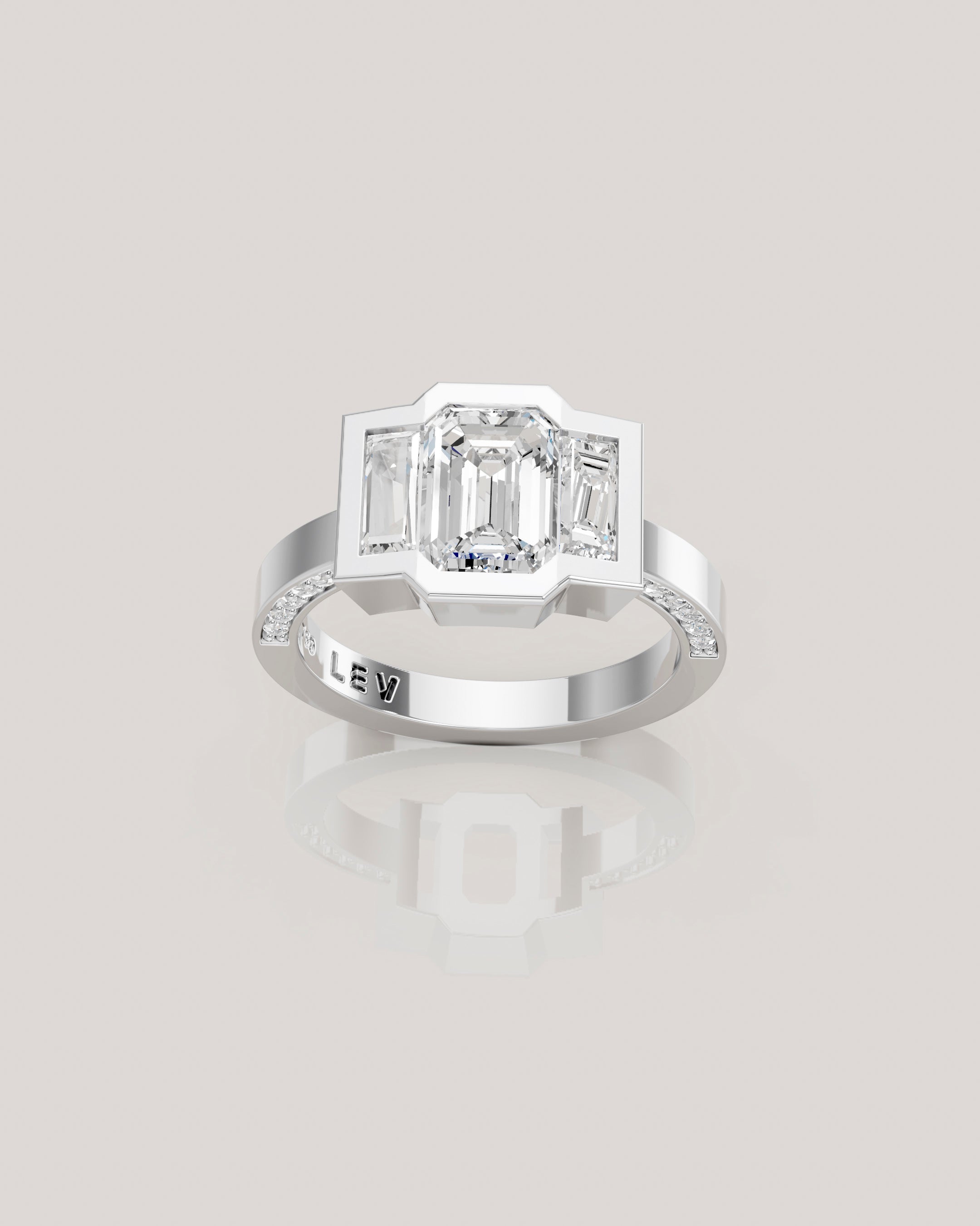 זוג יהלומי באגט צידיים ושיבוץ יהלומים קטנים לאורך שתי הדפנות הפנימיות בטבעת