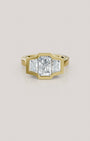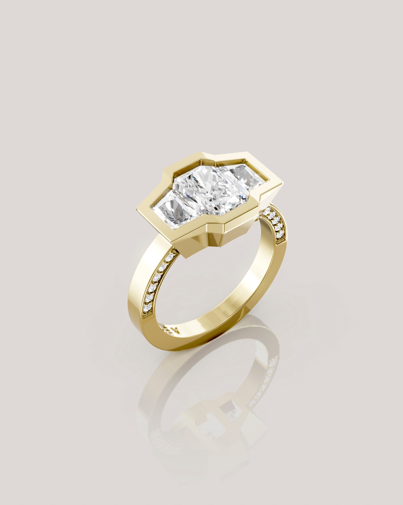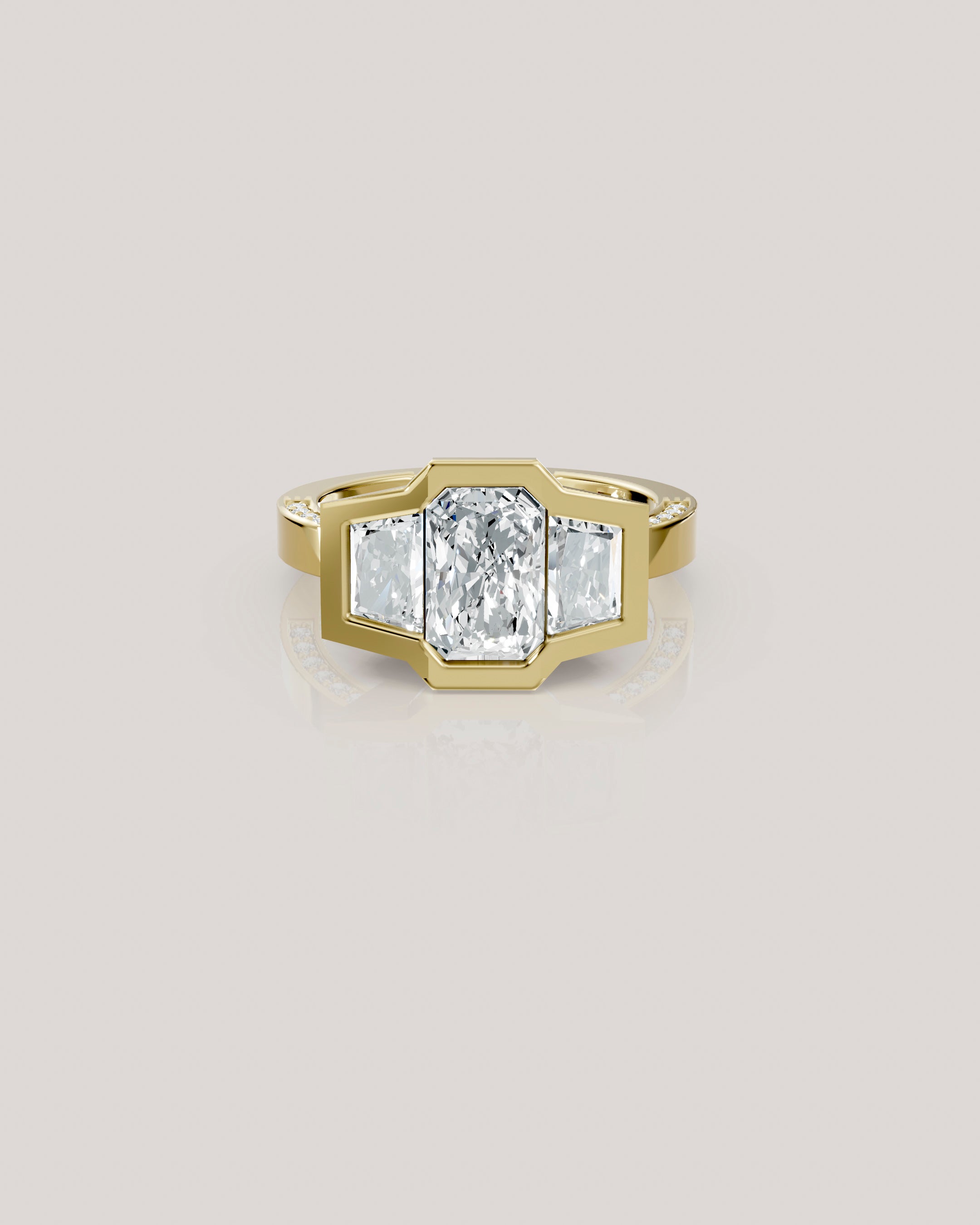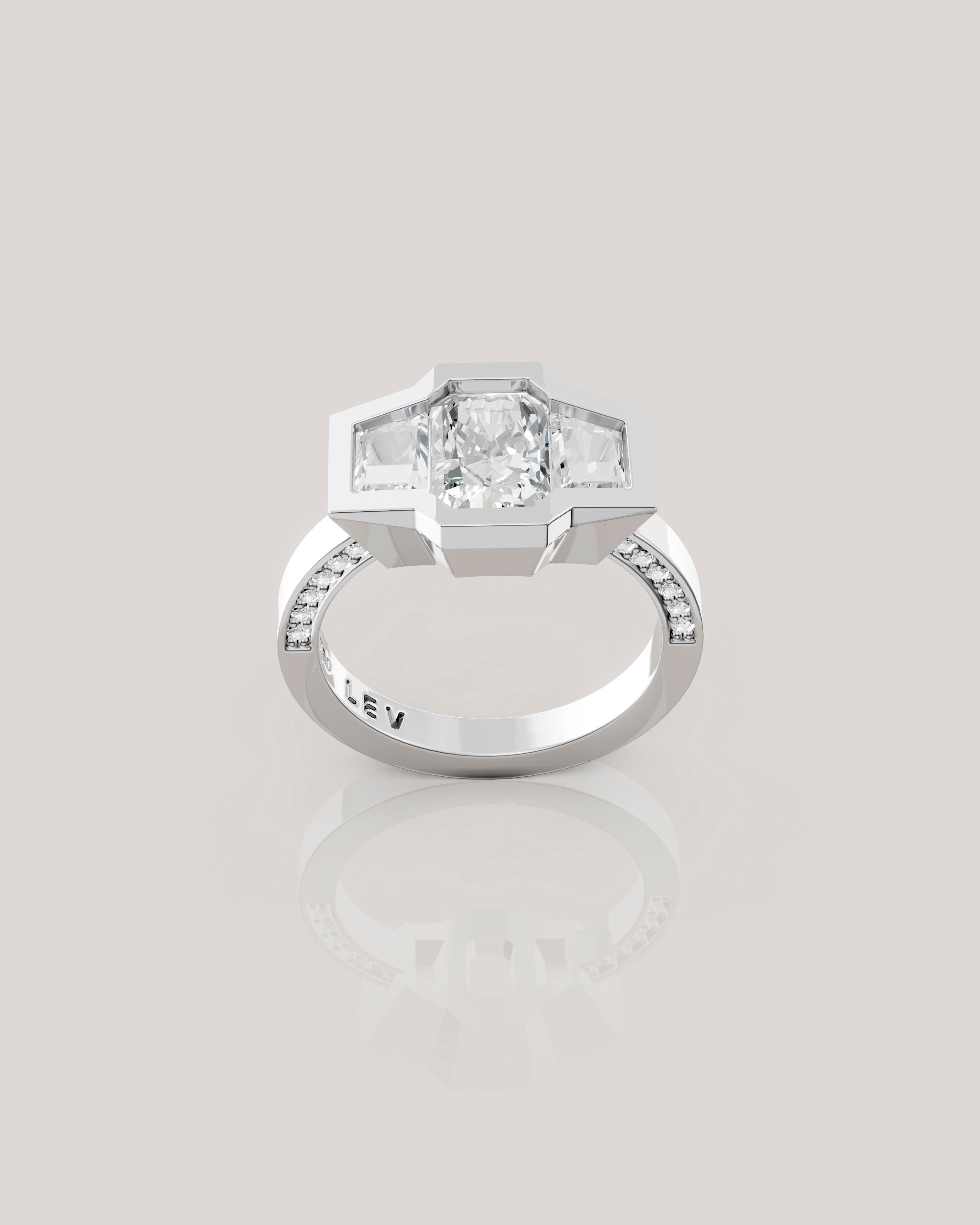 זוג יהלומי טרפז צידיים ושיבוץ יהלומים קטנים לאורך שתי הדפנות הפנימיות בטבעת